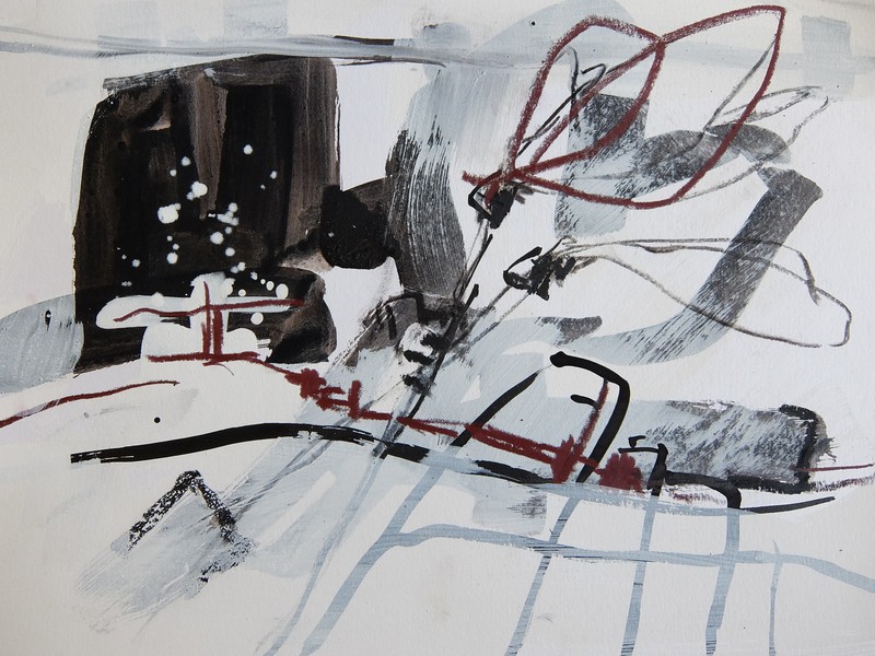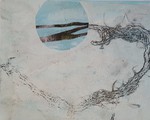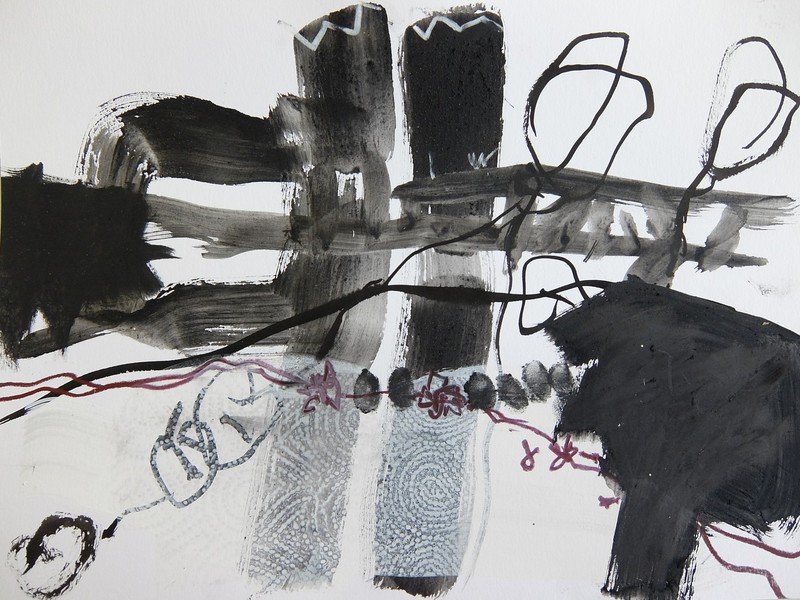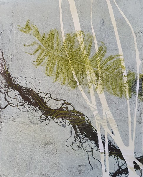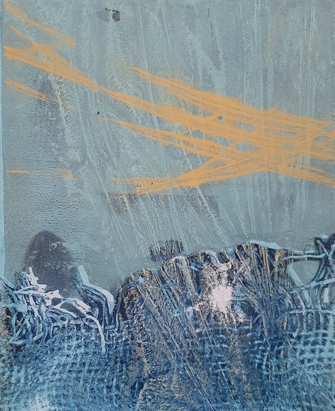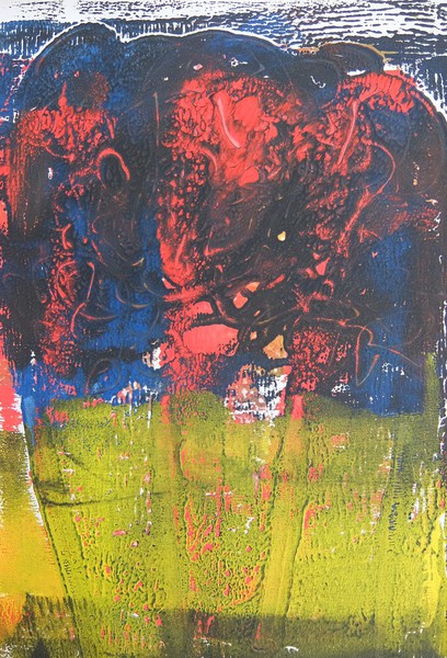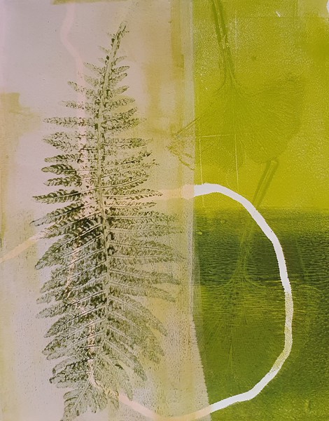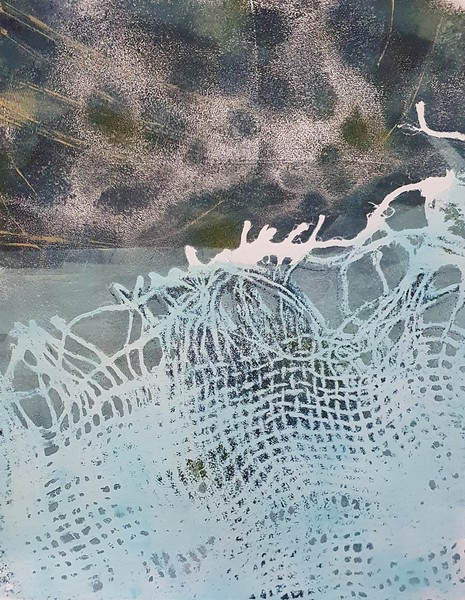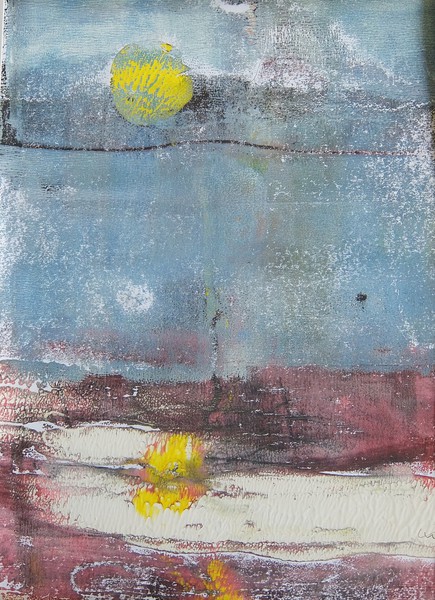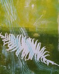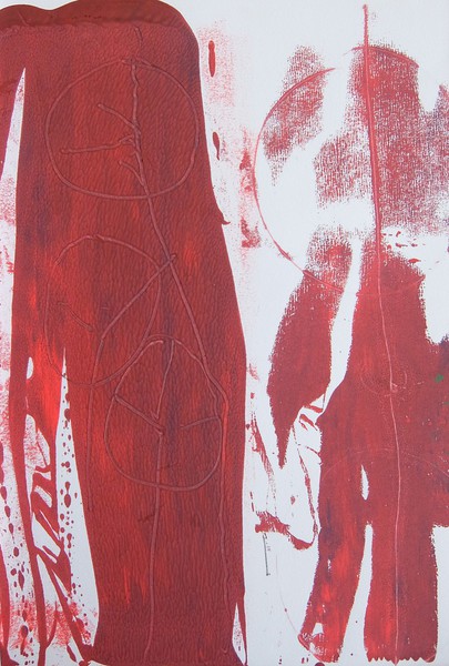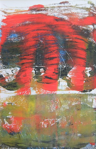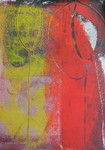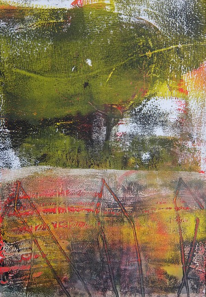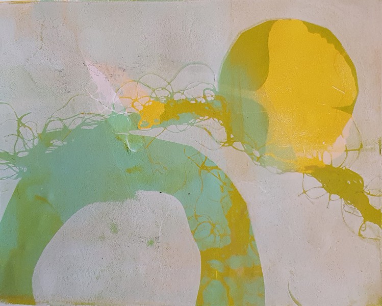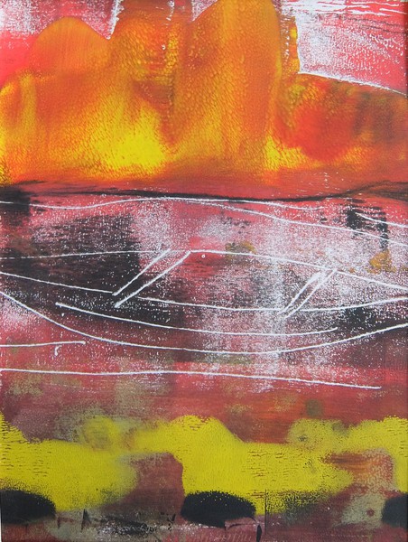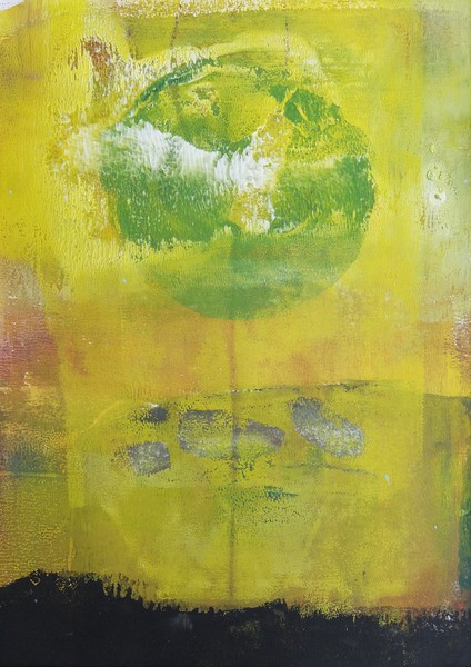 Die Monotypie ist eine experimentelle Drucktechnik, bei der nur ein einziges Exemplar gedruckt werden kann. Es entstehen Originale, die nicht vervielfältigt werden können. Ich habe eine Glasplatte mit Linolfarben eingefärbt. Darauf wird ein dünneres Papier gelegt, auf das wiederum mit Stiften, den Fingern oder anderen Materialien gezeichnet wird. Beim Abziehen des Papiers entstehen Abdrücke, die durch weitere Vorgänge intensiviert und gestaltet werden können. Der Zufall spielt bei dieser Technik eine besonders reizvolle Rolle.